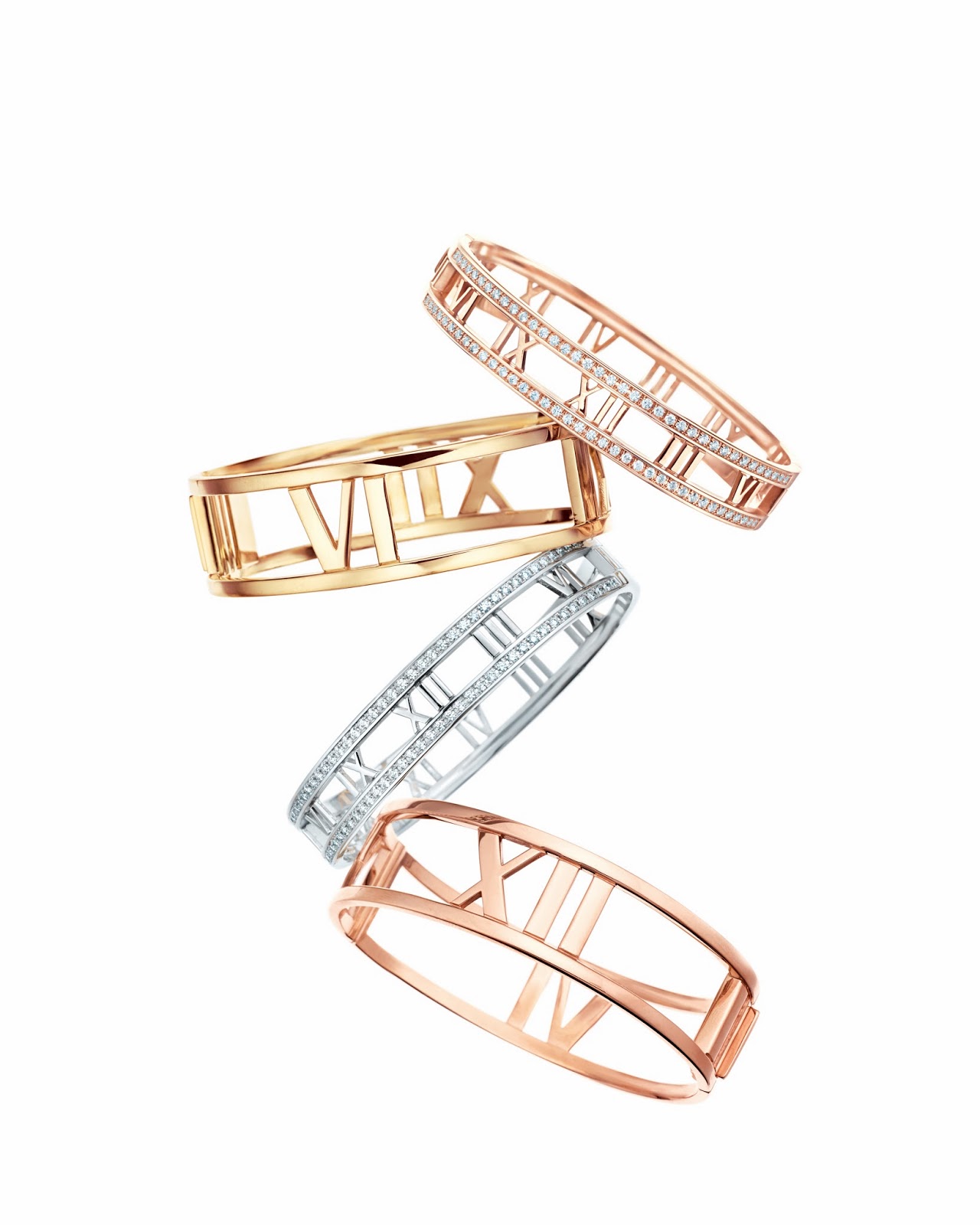 | Atlas bangles (from top): 18-karat rose gold with diamonds ($9,000), 18-karat gold (5,800), 18-karat white gold with diamonds (9,000) and 18-karat rose gold ($5,800) |