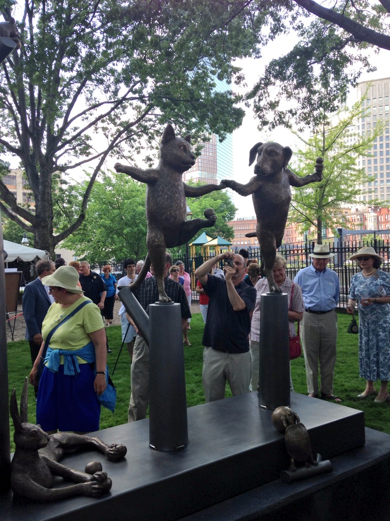 When the Animal Rescue League of Boston invited me to the unveiling of “Dancing with Spheres” I was thrilled at the idea of taking part in such a memorable occasion. The sun-drenched May afternoon welcomed supporters, four-legged friends, local politicians and the media to the League’s dog play yard at 10 Chandler Street in Boston for a grand celebration.