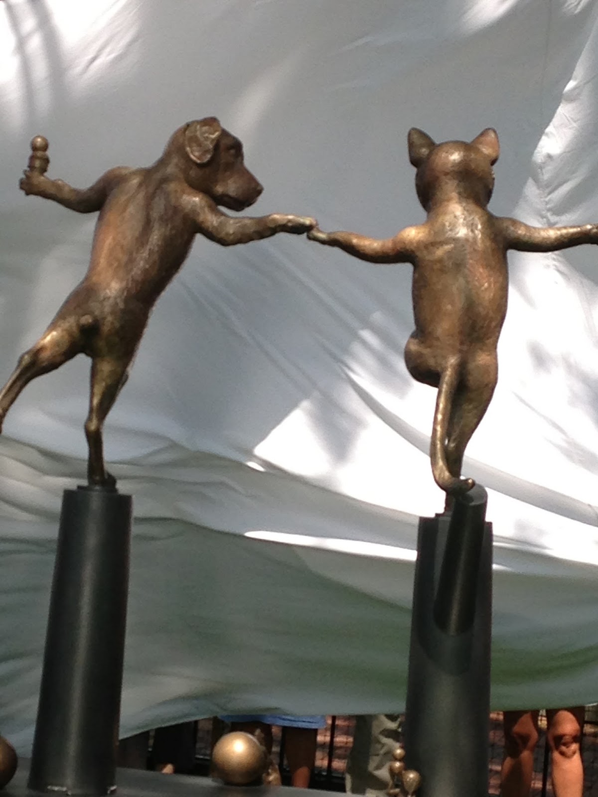 As the white drape lifted and the sculpture’s essence revealed for the fist time in public, the crowd sang in joy and amazement. The dog and cat playfully holding hands is a beautiful interpretation of love and friendship. The regal rabbit situated at the bottom caught my eye immediately. Giving off a dapper and refined aura, the hare stole my heart and is my favorite animal in the sculpture…sorry cat.