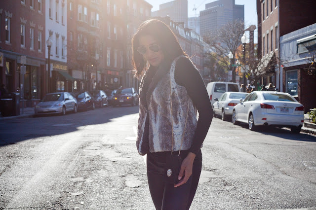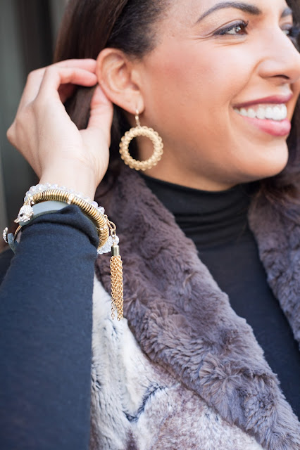 I chose a plush multi-color faux fur vest handmade in Seattle. It’s so incredibly soft and luscious. One touch and you’ll definitely want one in your wardrobe this season. The vest pairs perfectly with leather leggings and a fitted turtleneck (as I have shown) or slip it over a sheath dress in a deep hue like hunter green or eggplant. Lepore carries the vest exclusively in Boston, so consider this piece a rare find in New England. I was completely obsessed with my arm candy. The beaded bracelet with tassel charm is handmade from Bourbon and Bowties, and the crystal fox with leather band and expandable bangle both hail from a jewelry house in New York. Lastly, when I spotted the gold filigree earrings fresh from Italy, I knew I had to have them – without a doubt the perfect statement earrings.