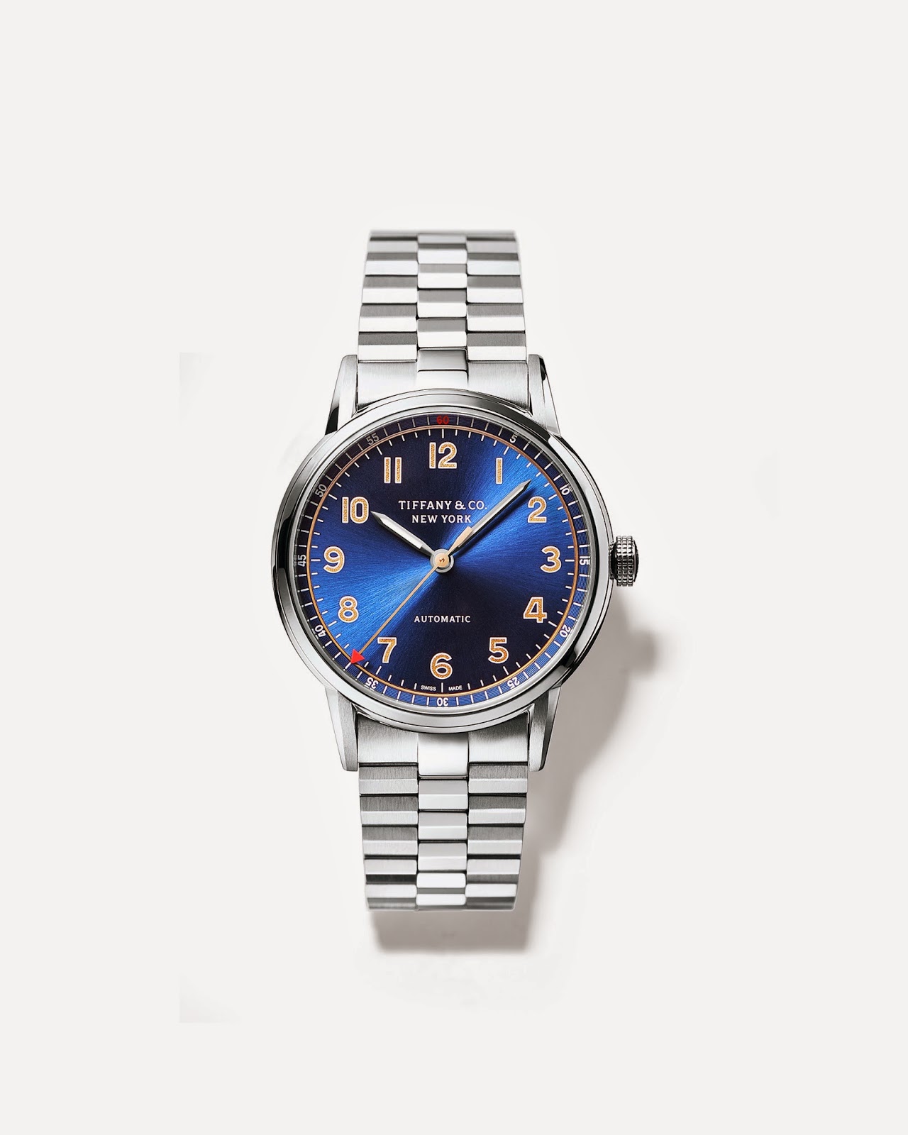 | Tiffany CT60 3-Hand in stainless steel, 34 mm, self-winding mechanical movement with a blue soleil dial // $4,250 |