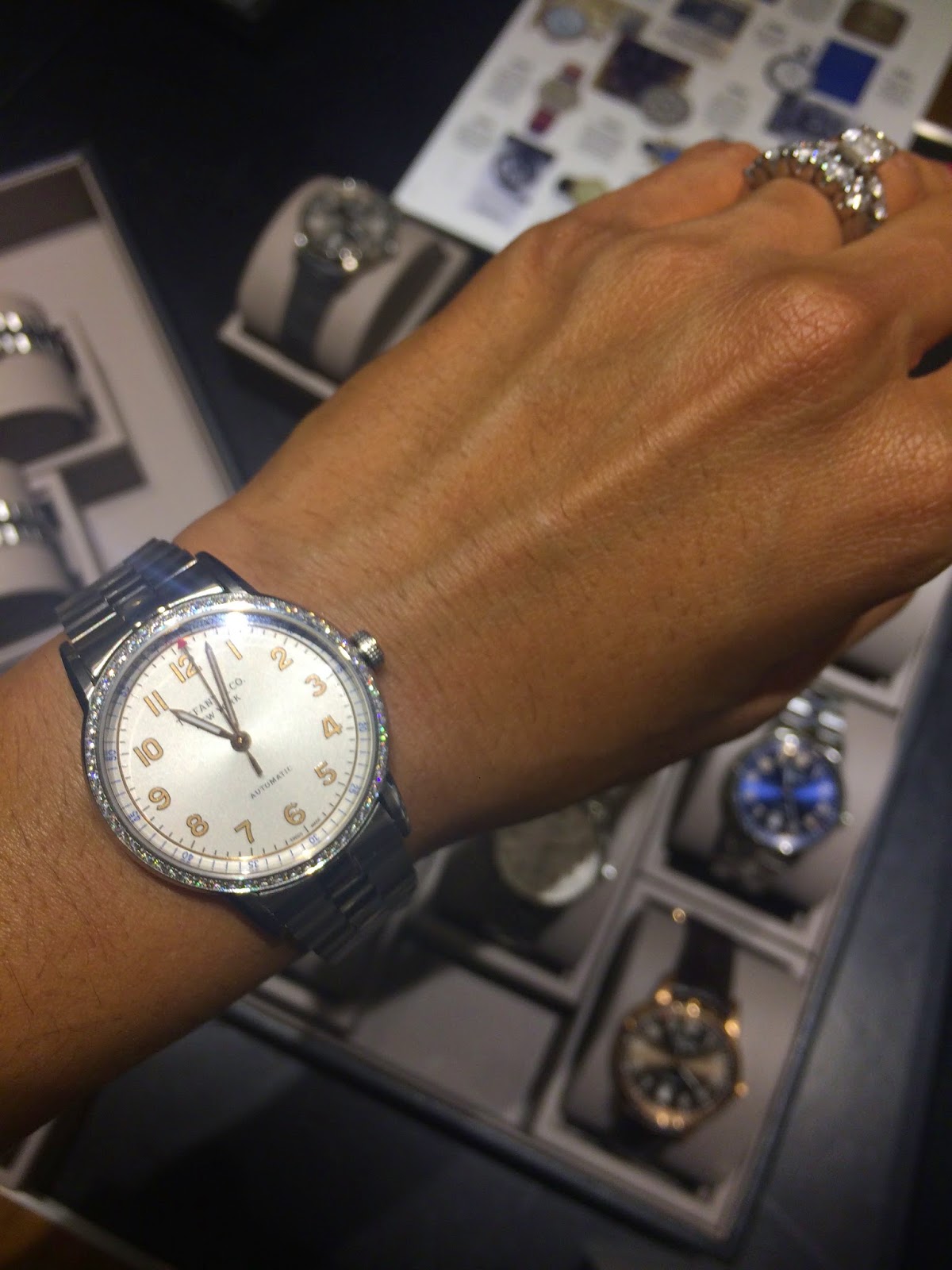 | Tiffany CT60 3-Hand in stainless steel with round-cut brilliant diamonds, 34 mm, self-winding mechanical movement with a white soleil dial // $8,750 |