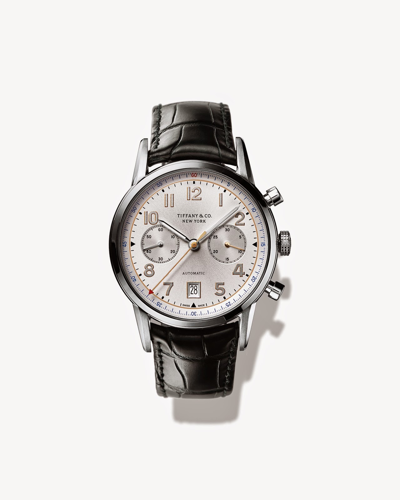 | Tiffany CT60 Chronograph in stainless steel, 42 mm, self-winding mechanical movement with a white soleil dial on a black alligator strap // $6,750 |