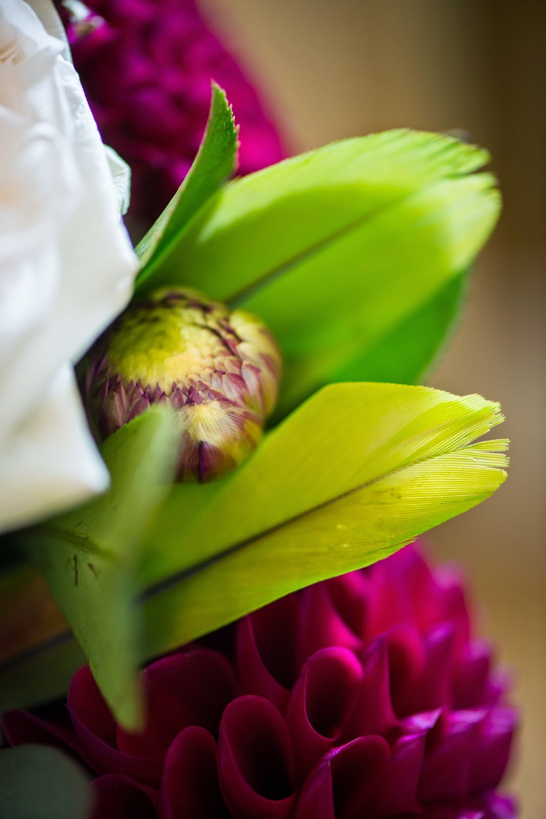 Today, Polly lives with a new family. I mean a girl (or parrot for that matter) could not ask for more wonderful parents than the couple who adopted Polly nearly two years ago. Polly had been shedding his tail feathers since he arrived at his new home (something very natural that he also did when I was growing up). Coincidentally, his parents had been saving the feathers (in a parrot jar no less) for no particular reason. As a matter of fact, the couple joked with their friends about what they should do with the mounting collection. Last summer, I called Polly’s parents to inquire about the possibility of incorporating some of his feathers into my bouquet (if in fact he’d shed any) and the rest is history.