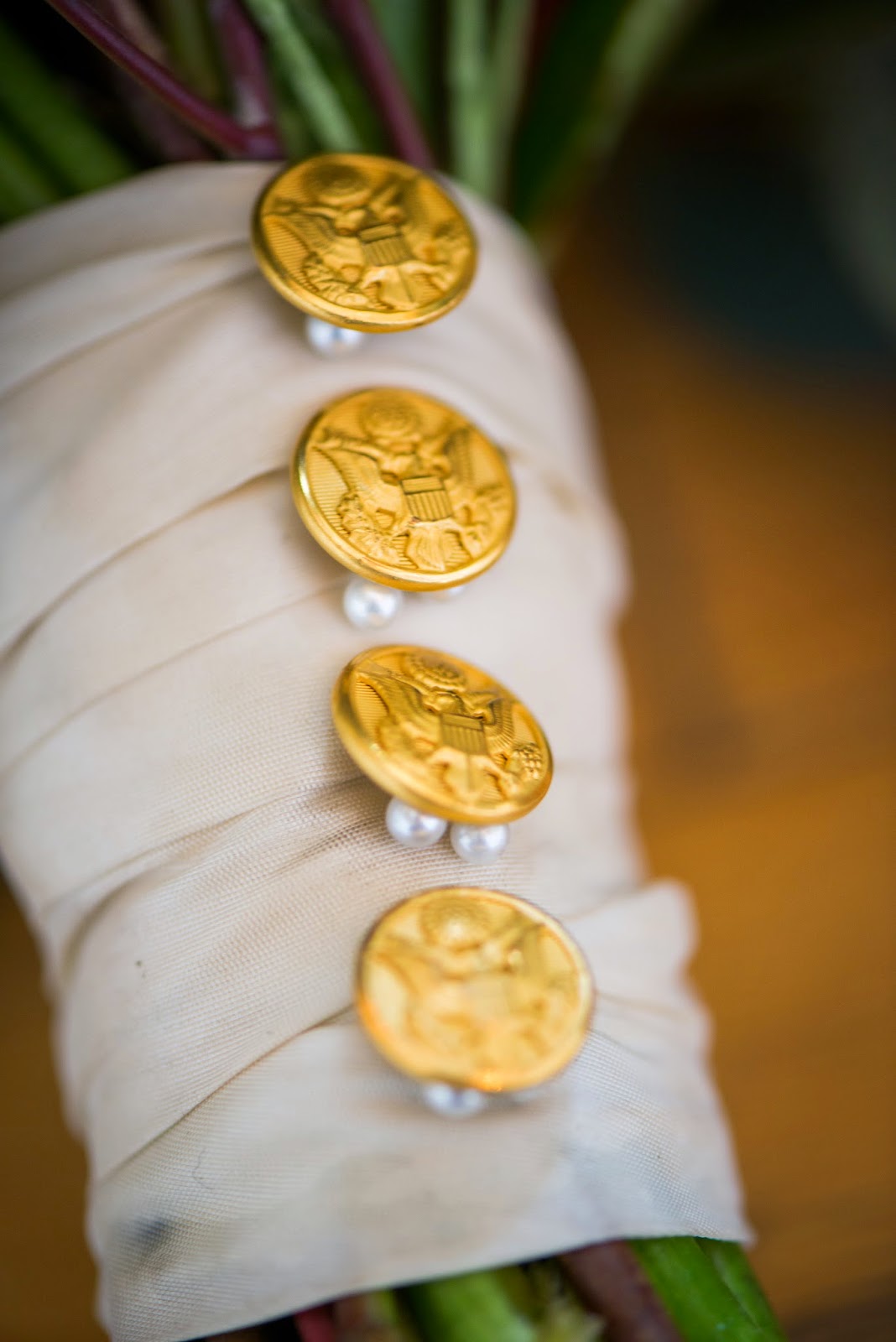 My bouquet’s stem was wrapped in silk champagne remnants from my wedding gown and dressed with brass buttons from my father’s U.S. Army coat. As a tribute to my late father’s memory and the bird he loved so very much (I love Polly too), I incorporated this intimacy as a way to keep them both close to my heart. Here’s a look at more stunning pieces designed for us on our special day.